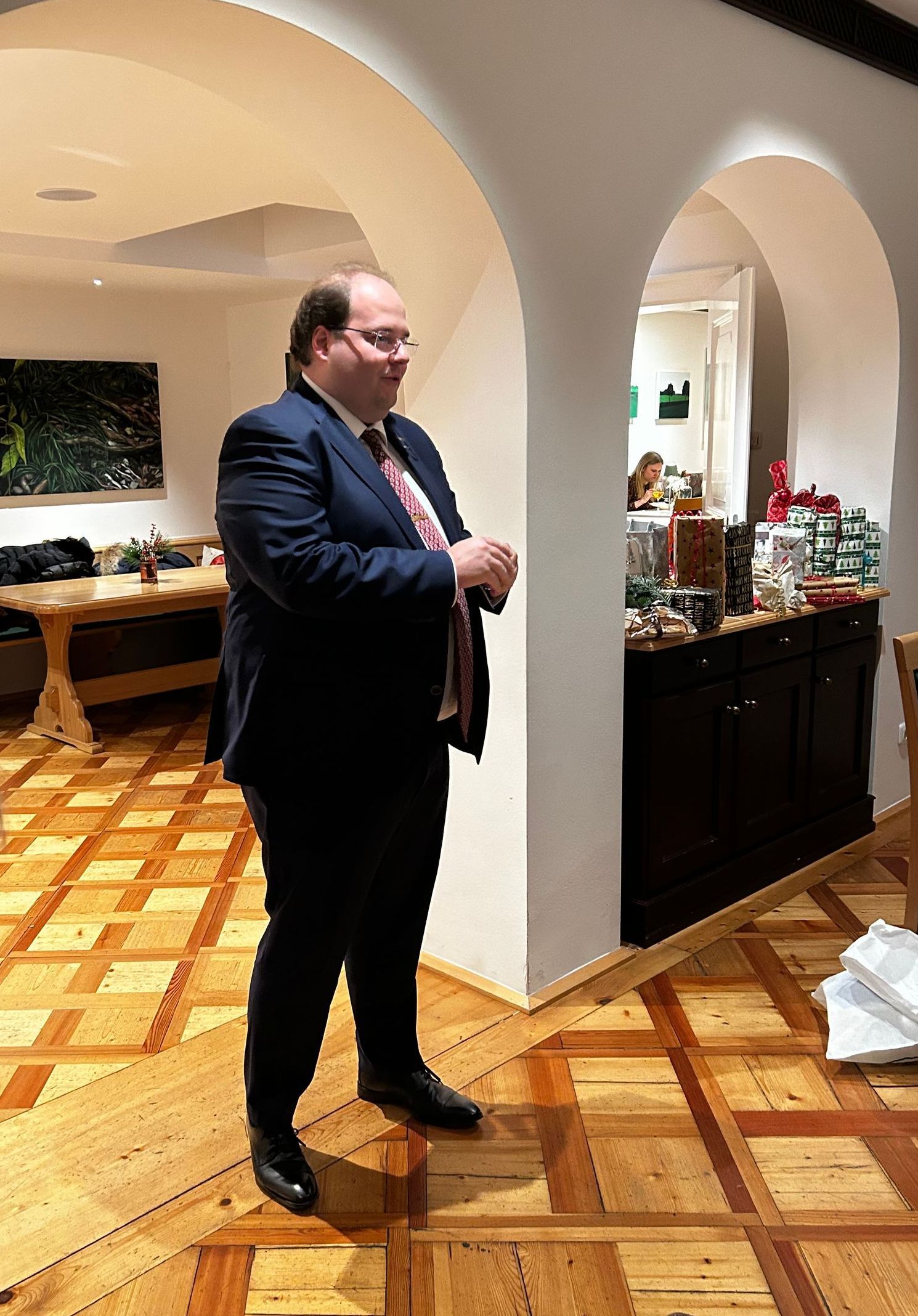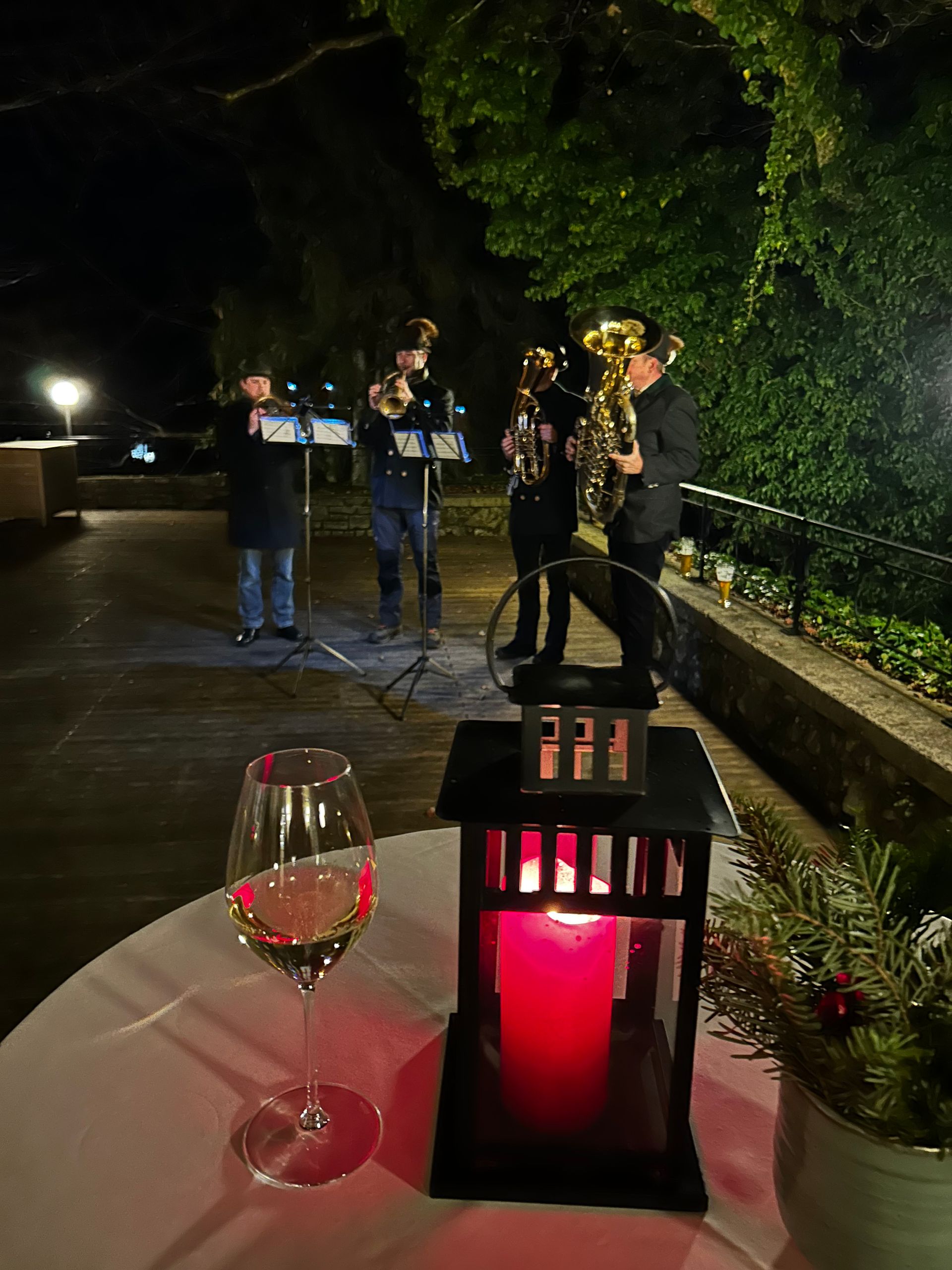 Dort angekommen erwartete uns ein Bläser-Quartett auf der See-Terrasse. Bei stimmungsvollen Weihnachtsliedern, dem einen und/oder anderen Glas Prosecco in Händen prosteten wir uns zu und feierten den wunderbaren Abend. Feierliche Musik trug unsere Blicke auf den See hinaus, der mittlerweile im Dunkel des Abends am Fuße des Landhauses entschwand.